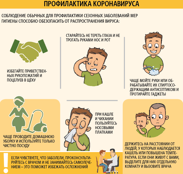 Профилактика коронавируса:— главное — следовать правилам гигиены. Мойте руки или пользуйтесь спиртовыми гелями, спреями и антисептическими салфетками;— не трогайте лицо грязными руками;— если вы носите маску, меняйте ее каждый час (максимум — каждые два часа);— находясь в общественных местах, максимально сократите прикосновения к посторонним предметам и поверхностям;— избегайте приветственных рукопожатий.При первых симптомах простуды оставайтесь дома, чтобы не заражать других. При появлении одышки обязательно обратитесь к врачу