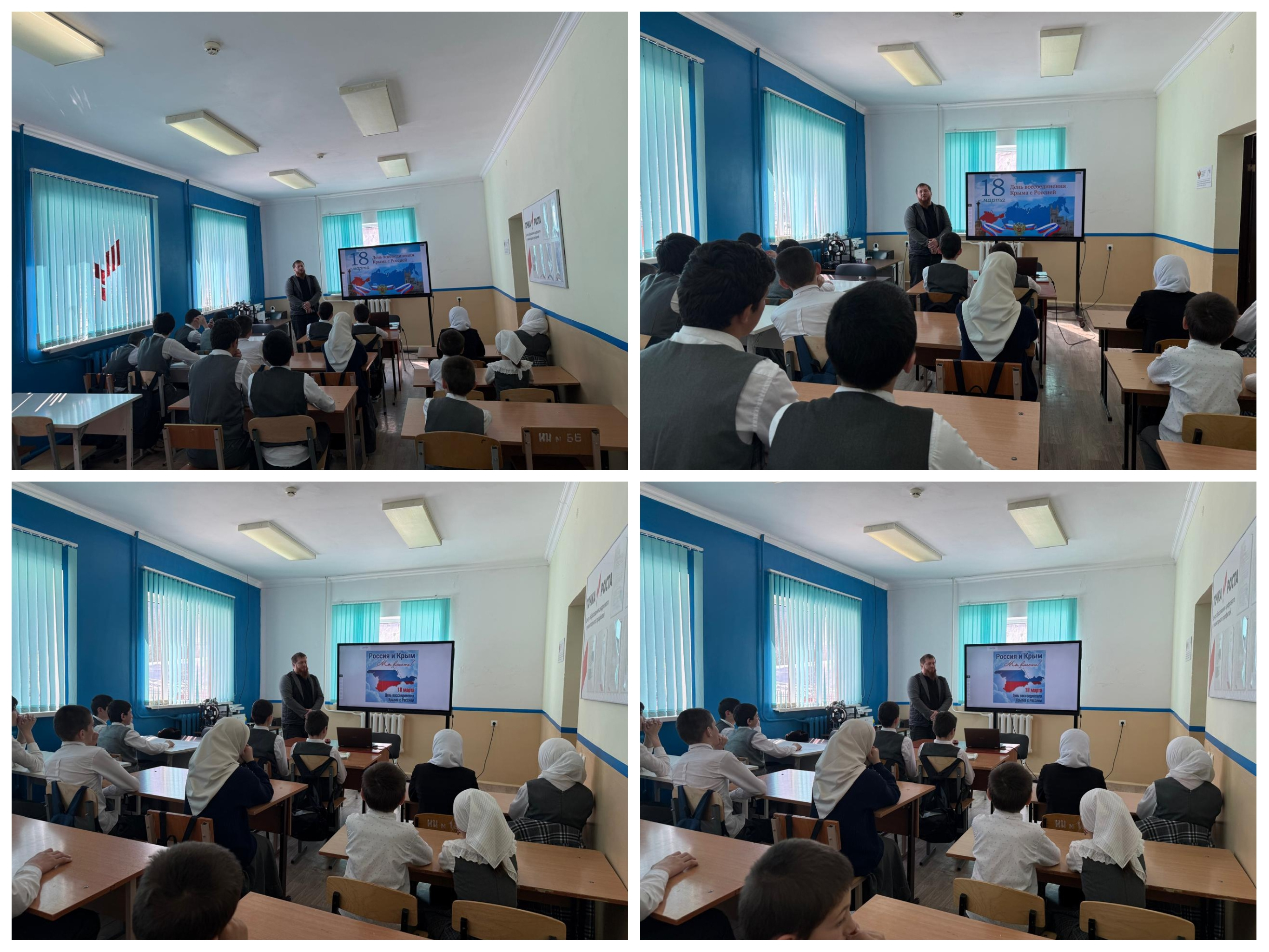 18.03.2025В преддверии дня воссоединения Крыма с Россией советник директора по воспитанию Мусалов А.М. провел с учащимися увлекательную интеллектуальную игру «Разговоры о Крыме».